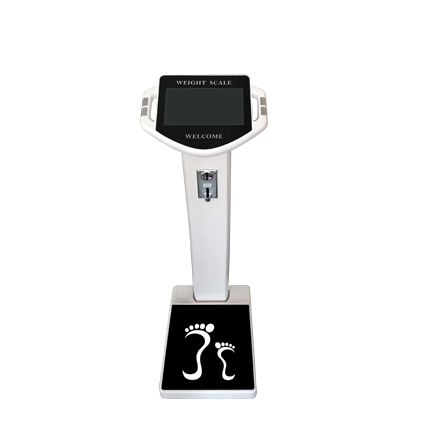 產品簡介:SH-100T智能投幣體重體脂秤小巧便攜美觀,可測量體重、脂肪人體成分等10余項健康指標,可自由設置投幣個數,支持多國語音播報,廣泛適用于商場、藥店、診所、健身房、機場等場所。